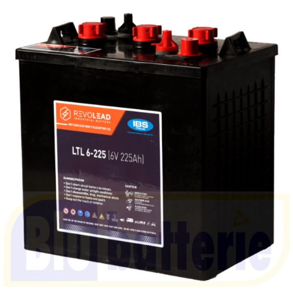LTL6-225, Revolead Batteria Piombo Acido Libero Deep Cycle 6V 225Ah Term. UT/LPT. Piastra piana. Dimensioni: 260x178xh. 285mm. Peso: 29Kg. Compatibile con batteria Trojan T-105. Le batterie della serie LTL al piombo acido deep cycle sono realizzate con piastra piana corazzata prodotta in Sud America seguendo standard di capitolato simili a quelli dei più importanti e riconosciuti produttori mondiali di monoblocchi. Pricipali applicazioni: Trazione leggera, macchine per la pulizia, golf car, piattaforme aeree, transpallet elettrici, carrelli per la piccola movimentazione merci. Avvertenze: Non scaricare mai la batteria oltre l'80%, per le batterie 6V limite max 5,4V. Tensioni da rispettare: fase di scarica D.O.P. 1,75V per elemento, fase di carica uso ciclico 2,65V per elemento. Sostituire sempre tutte le batterie montate sull'apparato. Il non rispetto di queste avvertenze fa decadere la garanzia.